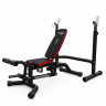 Расстояние между стойками в 55.5 см позволяет использовать самые разные виды штанг. В комплекте идут специальные валики, которые можно использовать как для жима руками, так и для жима ногами. Цвет спинки скамьи - ярко-голубой. Четырёхпозиционная спинка регулируется по углу наклона, что позволяет настроить тренажер под индивидуальные особенности пользователя и выполнять самые разные упражнения.